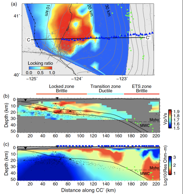 图2.Cascadia俯冲带南段板块界面的震间耦合模型(a)以及沿着CC’剖面的地震波速比模型(b)和前人的电阻率模型(c)。