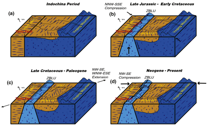 图3 本研究提出的郯庐断裂带巢湖段自印支期以来的四阶段构造演化和变形模式。