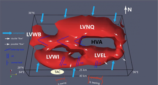 图2. 青藏高原中地壳横波速度的三维示意图。红色曲面表示 25 公里至 40 公里深度的地壳中Vs=3.35 km/s 的等值面。以示意图标注地质单元以及构造演化过程。TAC: 特提斯增生杂岩; IL—印度岩石圈。