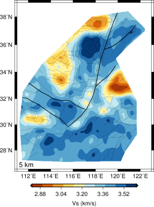 图2 研究区域5 km、15 km、25 km和35 km深度横波速度切片