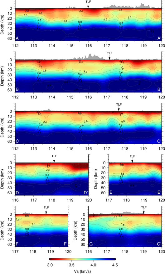 图1 研究区域中的地震台分布(左图)。黑色三角形为固定台,红色三角形为流动地震台。AA’、BB’、CC’、DD’、EE’、FF’和GG’所对应的横波速度剖面见右图所示。