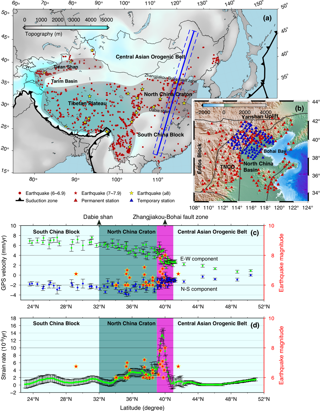 图1. (a)平滑后的地形图和中国境内大地震分布,阴影区域代表地震活动密集区域。图中蓝色实线和虚线框指示了c和d图展示的剖面位置。(b)研究使用的地震台站分布图,图中黑线表示华北克拉通主要构造边界位置。(c)为沿a图中蓝色实线的地表GPS速度剖面 (Wang & Shen, 2020。参考文献见论文正文),绿色和蓝色点分别代表GPS速度的东西和南北分量,黄边红色五角星代表震级大于6的地震事件。(d)为沿a图中蓝色实线的应变率剖面。