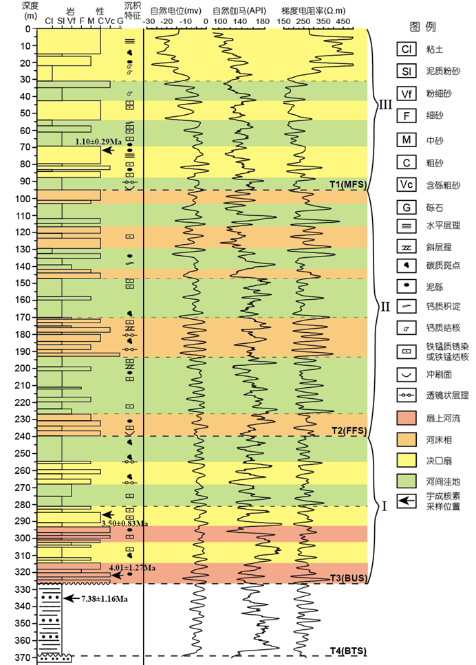 板泉盆地地层结构及沉积旋回对盆地经历的幕式拉分伸展有着明显的响应。强烈拉分发生前,受局部裂陷作用,盆地内缓慢堆积了一套薄层中新世泥岩。拉分伸展早期和晚期阶段盆地内先后充填了粗颗粒冲积扇相(沉积体系Ⅰ)和相变频繁的辫状河-曲流河相(沉积体系Ⅱ)地层,后拉分阶段沉降期盆地内充填了一套泛滥平原相地层(沉积体系Ⅲ)