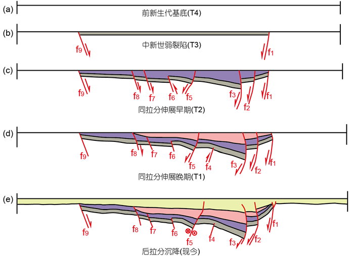 研究表明,板泉盆地表现出幕式拉分的生长过程,大致经历了前拉分弱裂陷-同拉分伸展-后拉分沉降三个演化阶段。 前拉分时期控制盆地发育的郯庐断裂带活动微弱,随后断裂活动增强,使得盆地经历了两期拉分伸展,第一期拉分作用影响范围广泛,第二期拉分作用导致了湖盆东缘及中心的扩张沉降,断裂活动向盆地中心迁移,湖盆扩展达到鼎盛时期。随后盆地进入整体沉降阶段,盆地中央孕育新的走滑断层,有效分解了盆缘断裂的正断活动,使得拉分盆地逐渐萎缩消亡(图2)。
