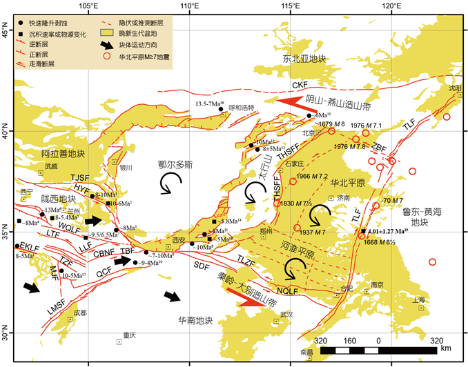 晚新生代青藏高原的向东扩展和挤出对中国大陆影响广泛而深刻。青藏高原中东部岷山、祁连山、六盘山等山脉快速隆升以及大型走滑断裂东昆仑断裂带东段、海原断裂带东段和西秦岭断裂带的左旋走滑运动开始时间普遍发生在距今8Ma左右。与此同时,华北地块内的“盆-岭”地貌体系也记录了相应的造山-成盆事件(图4)。前人曾构建了华北地块区的次级地块在青藏高原东缘挤出作用下发生逆时针转动、南北两端NWW向断裂带发生左旋走滑以及块体间包括郯庐断裂带在内NNE向断裂右旋走滑的运动学模型,在一定程度上较为科学合理地回答了华北平原现今构造变形机制(图4)。