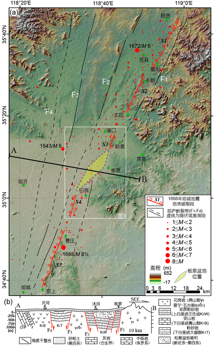 1 1668年郯城地震地表破裂展布及板泉盆地构造位置图