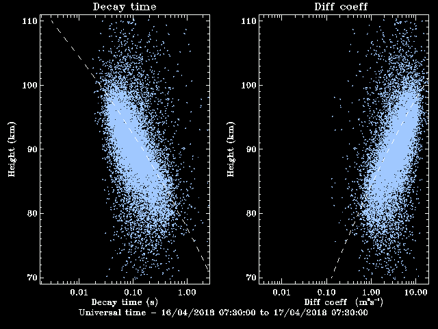 图2 蒙城流星雷达观测的2018年4月16日流星余迹回波的衰减时间(左)和流星余迹的双极扩散系数(右)